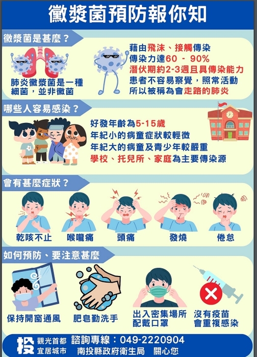 2.剛開始全身疲倦無力、頭痛、咽喉痛及輕微發燒,接著2-4天會出現乾咳,年齡越小的病童症狀越輕微,反而是年齡較大的學齡兒童或是青少年,症狀反而較明顯且嚴重;